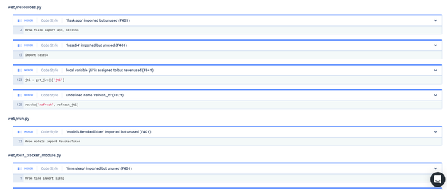 I used pyflake for static analyse. the results are pretty decent as we see in following images. And there are no criticial issues in the code.
