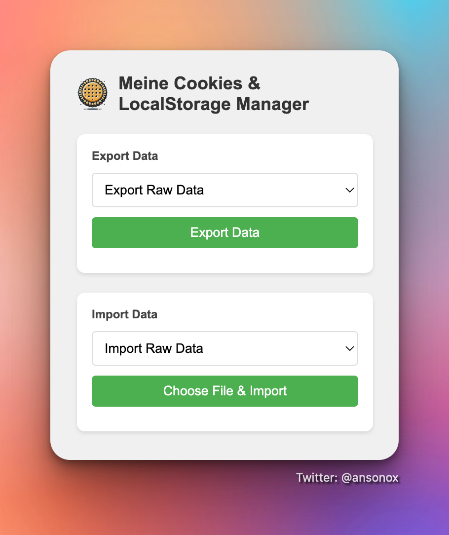 No bulls**t 💩, no ads, nada - just import and export cookies and local storage data.