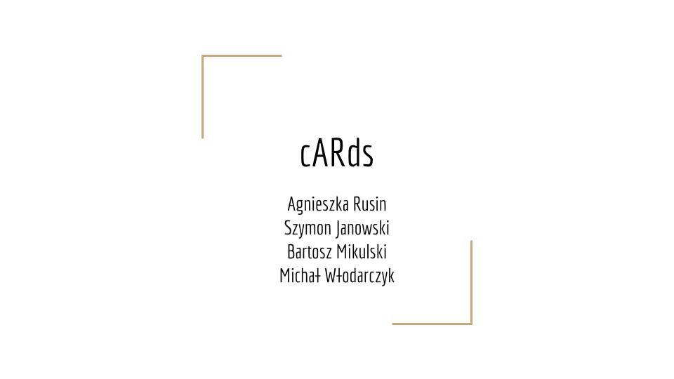 Projekt cARds jest aplikacją implementującą mechanizmy rozszerzonej rzeczywistości (ang. Augmented Reality). Odpowiednio oznaczone karty układane są w zasięgu kamery. Aplikacja wykrywa znaczniki umieszczone na kartach oraz nakłada na nie animowane modele 3D. Efekt ten widoczny jest na ekranie komputera, który rejestruje obraz z kamery. Cały proces odbywa się w czasie rzeczywistym. Karty można dowolnie podnosić czy przesuwać, a model nadal wyświetlany będzie na powierzchni karty. Jako tematykę modeli umieszczanych na kartach wybraliśmy popularną grę Pokémon. Seria Pokémon posiada różne wydania własnych gier karcianych (Pokémon TCG). Poprzez proste nałożenie odpowiednich znaczników na karty możemy urozmaicić chociażby turnieje rozgrywane pomiędzy pasjonatami przed szerszą publicznością. Dzięki zastosowaniu architektury klient-serwer poprzez odpowiednie przygotowanie aplikacji możemy udostępniać usługę, gdzie każdy może cieszyć się rozszerzoną rzeczywistością na swoim urządzeniu.