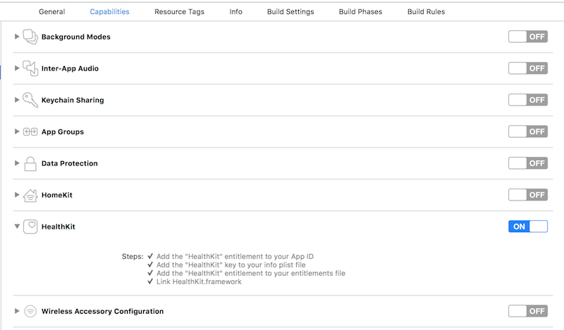 RCTAppleHealthkit.xcodeprojin the project navigator and go theBuild Settingstab. Make sure 'All' is toggled on (instead of 'Basic'). In theSearch Pathssection, look forHeader Search Pathsand make sure it contains both$(SRCROOT)/../../react-native/Reactand$(SRCROOT)/../../../React- mark both asrecursive. - Enable Healthkit in your application's