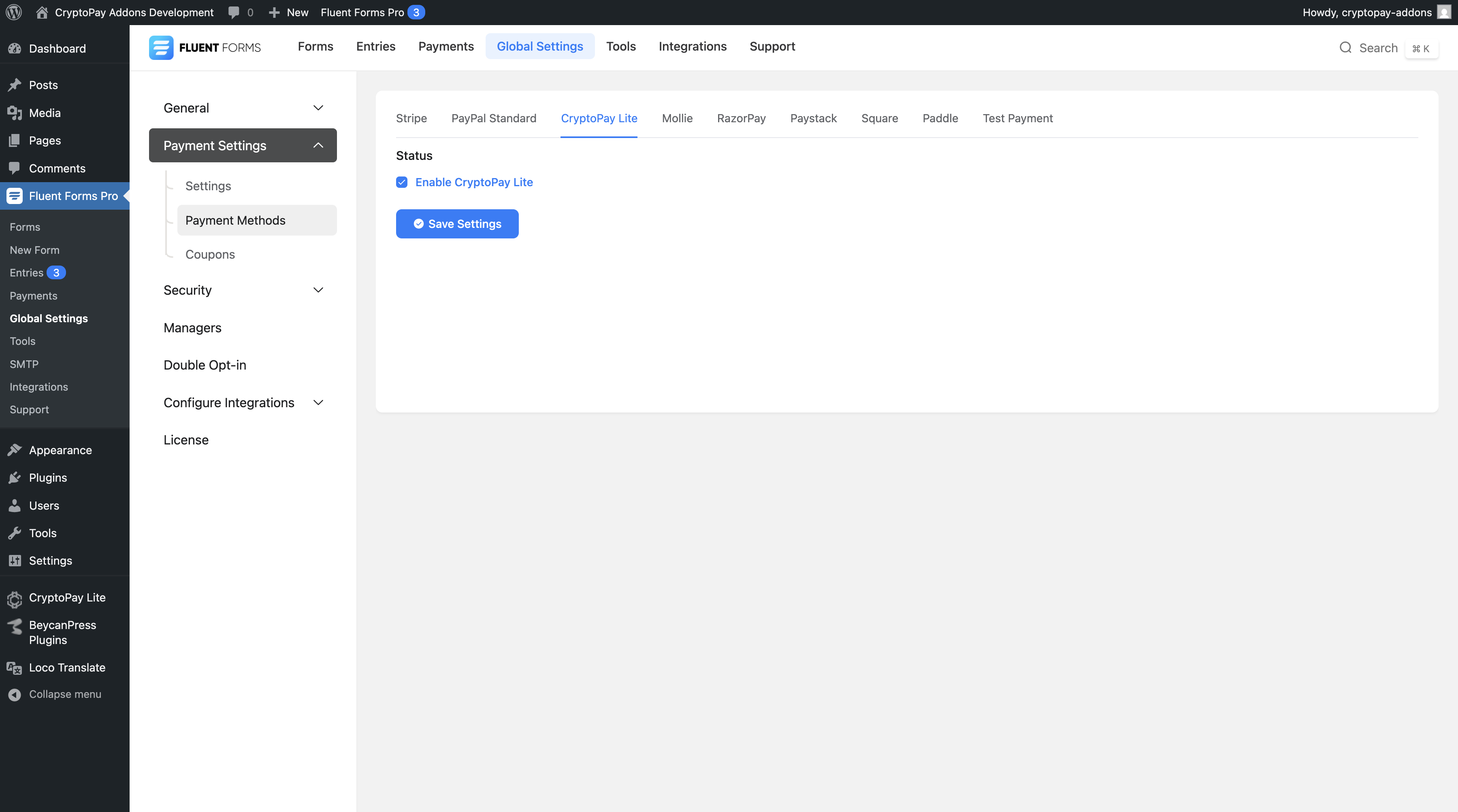 This plugin acts as an extension of the CryptoPay system, so you’ll need either the free (Lite) or paid (Premium) version of CryptoPay installed on your WordPress site. You’ll also need Fluent Forms active.