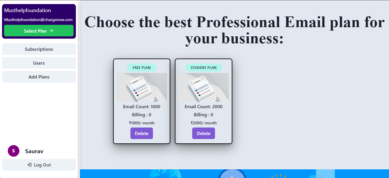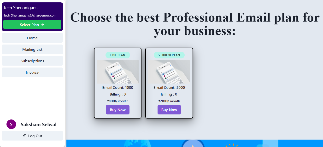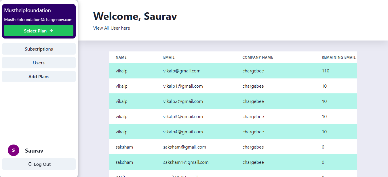 Charge Now is a bulk mailing web service where user can create a mailing list and send mails to all all of those emails with just one click, with realtime status for mails sent. This project also has admin access where the admin can add or remove service plans that the users can buy.