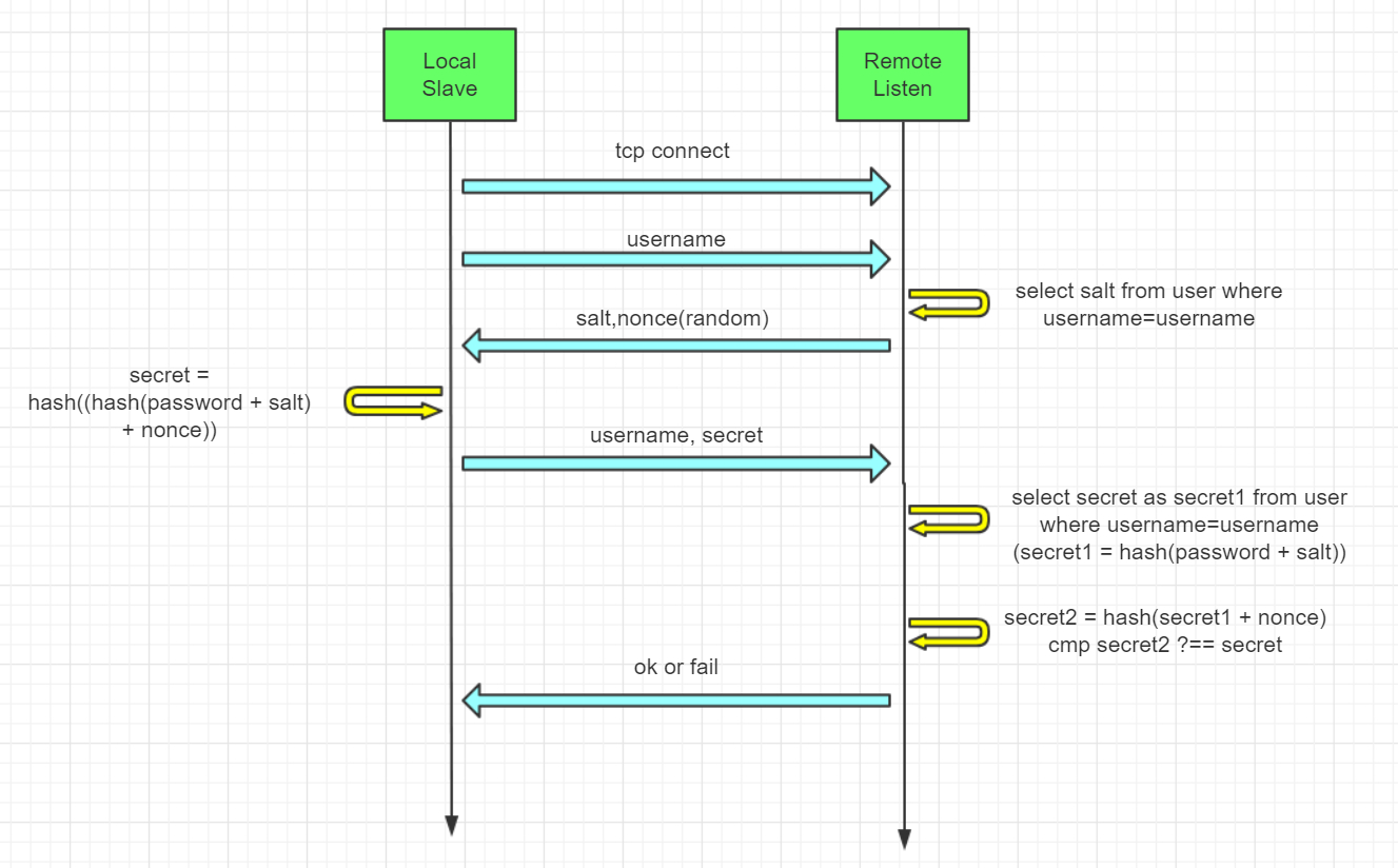 用户密码使用 MD5 加盐加密存储,协议的握手使用随机因子防止重放攻击