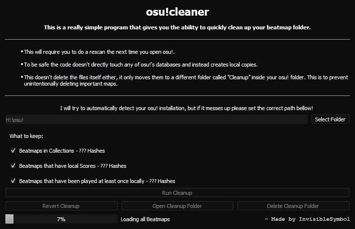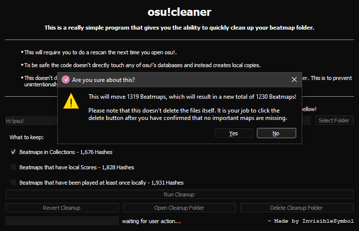 Well I tried my best in making it foolproof. Beatmaps are copied to said "Cleanup" folder and not directly deleted, and I added a Button that reverts everything. I also don't directly access any of osu!'s databases; instead I create local copies and read those. Overkill, but better safe than sorry. It is still your Job to make sure no important maps are going to get deleted.