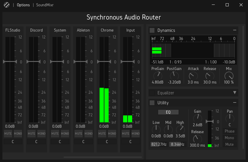 SoundMixr is a simple audio mixer for ASIO devices, but specifically made for SAR (http://sar.audio/), it sees all the channels in the ASIO device and shows them with the option to route any input to any output. You can also split any channel into mono channels, or combine them to make channels with as many lines as you like. Each channel also has a mute, mono, stereo pan and volume parameter. Each channel has its own effects chain in which you can add the built-in effects (Dynamics, Equalizer, Utility, more soon!). You have the ability to bypass effects and rearrange them by dragging them to a new position in the chain.