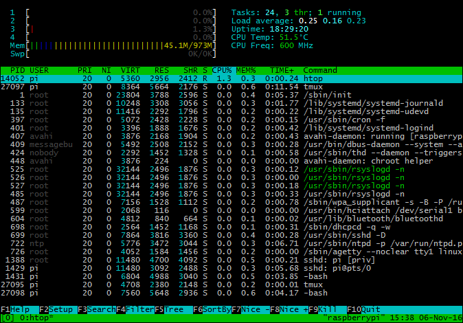 topyou are subject to a delay for each unassigned key you press (especially annoying when multi-key escape sequences are triggered by accident). htopstarts faster (topseems to collect data for a while before displaying anything).- In