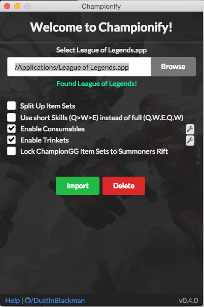 Run Championify, the app will try and look for your League of Legends.app for you. If the app can't find it, browse and select your League of Legends.app.
