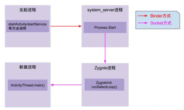 - system_server进程:调用Process.start方法,通过Socket向Zygote进程发送新建进程的请求