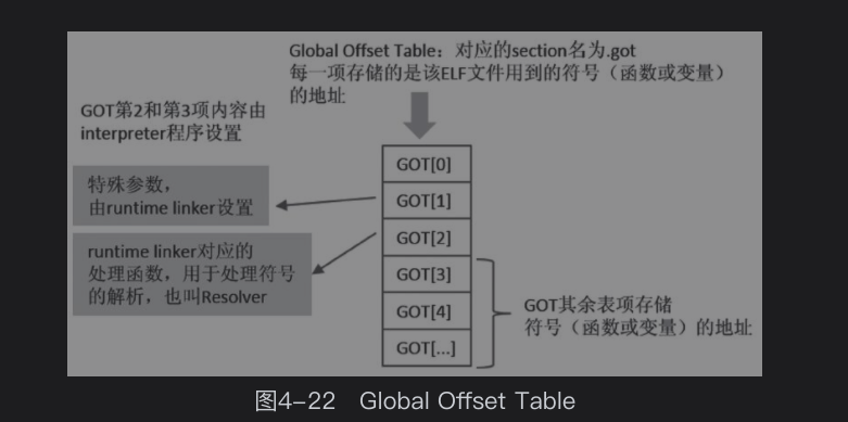 GOT其余表项存储符号(函数或变量)的地址。特别注意:其余表项中的值将由Resolver动态填写。即,当调用者第一次访问这些符号的时候,将触发Interpreter的Resolver函数被调用,该函数将计算符号的最终地址,然后填写到GOT对应项中。而符号地址的计算方法依赖于ELF文件中重定位和符号表中的一些信息。
