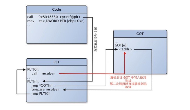 - PLT[1]存储的是跳转到符号对应GOT表中的内容,如果该符号的地址还未计算,该内容存储的其实是一条用于将计算 这个符号地址所需的参数压栈的指令的地址,然后PLT[1]接着执行到PLT[0]即resolver。如果这个符号地址已经计算过,那么就直接跳到目标地址上了。