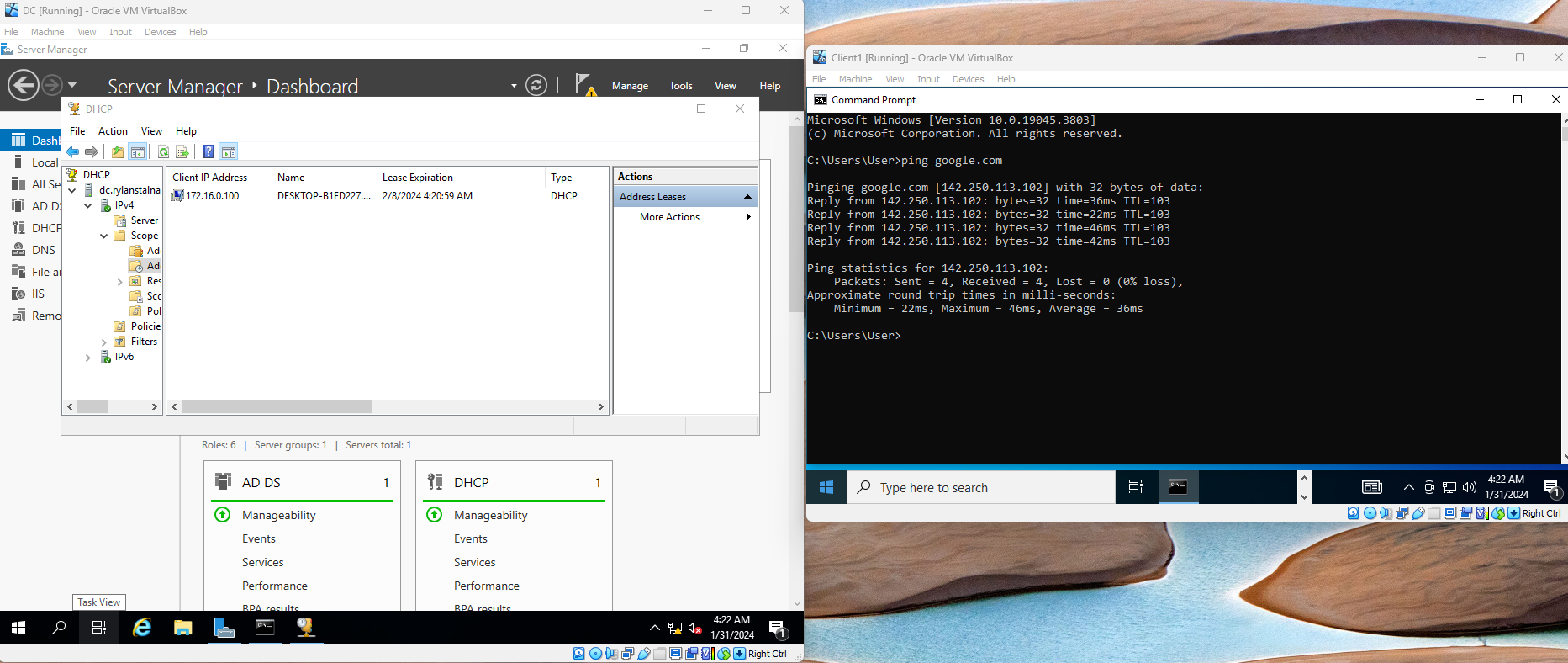 - Installed DHCP Server role on the DC.