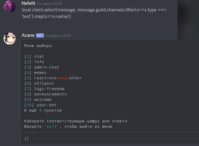 // Плагин доступен в client.chooselet selected = await client.select(message, message.guild.channels.map(x=>x.name));