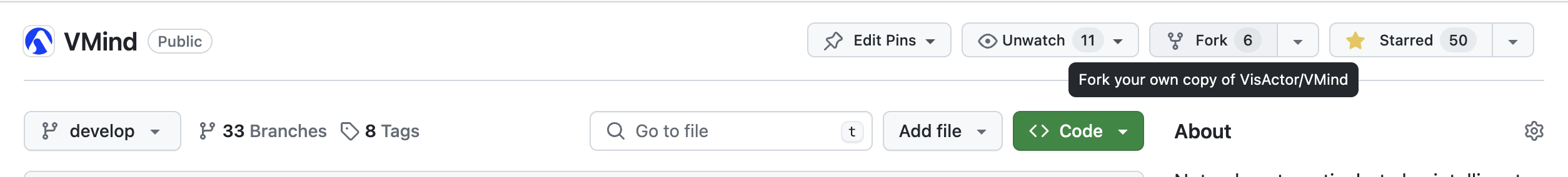 - Now we can start contributing our code. VMind default branch is the develop branch. Whether it is feature development, bug fixes, or document writing, please create a new branch and merge it to the develop branch. Use the following code to create the branch: