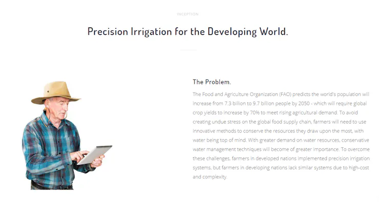 The Food and Agriculture Organization (FAO) predicts the world's population will increase from 7.3 billion to 9.7 billion people by 2050 – which will require global crop yields to increase by 70% to meet rising agricultural demand. To avoid creating undue stress on the global food supply chain, farmers will need to use innovative methods to conserve the resources they draw upon the most, with water being top of mind. With greater demand for water resources, conservative water management techniques will become of greater importance. To overcome these challenges, farmers in developed nations implemented precision irrigation systems, but farmers in developing nations lack similar systems due to high-cost and complexity.