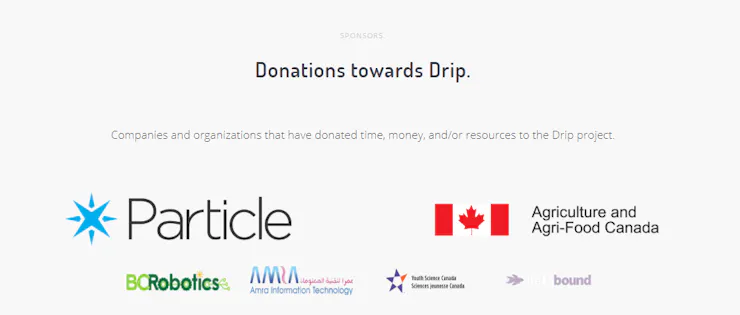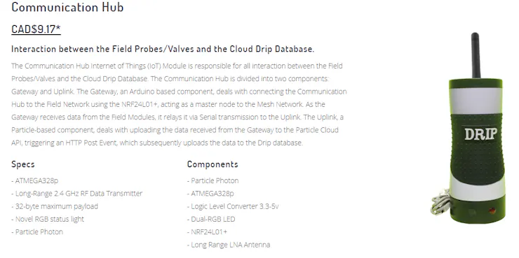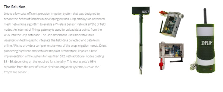 Drip is a low-cost, efficient precision irrigation system was designed to service the needs of farmers in developing nations. Drip employs an advanced mesh networking algorithm to enable a Wireless Sensor Network (WSN) of field nodes. An Internet of Things gateway is used to upload data points from the WSN into the Drip database. The Drip dashboard uses innovative data visualization techniques to integrate the field data collected and data from online API’s to provide a comprehensive view of the crop irrigation needs. Drip’s pioneering hardware and software modular architecture, enables a base implementation of the system for less than $12, with additional nodes costing $3 - $6, depending on the required functionality. This represents a 98% reduction from the cost of similar precision irrigation systems, such as the CropX Pro Sensor.