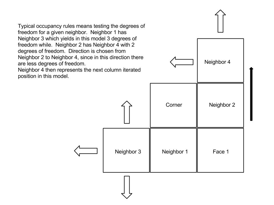 There are cases when the rules for direction yield a false positive, that is, where the direction is changed relative to the general orientation of the column by column 2x2 list population. Mostly this occurs either leading to an ambiguous condition at the outset of a given new row, where either neighbor may have the same degrees of freedom, or at the row space boundary conditions leads to the same ambiguity. In this case where the row space boundary has been encountered, I simply tossed out the zero degrees of freedom in determining direction. Elsewhere this condition is left open.