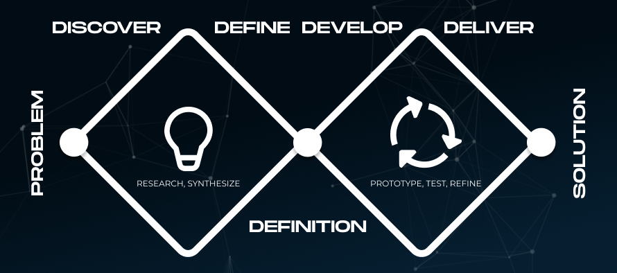 We utilized the Double Diamond Process; this design method not only includes visual design, but a full-fledged research cycle in which you must discover and define your problem before tackling your solution