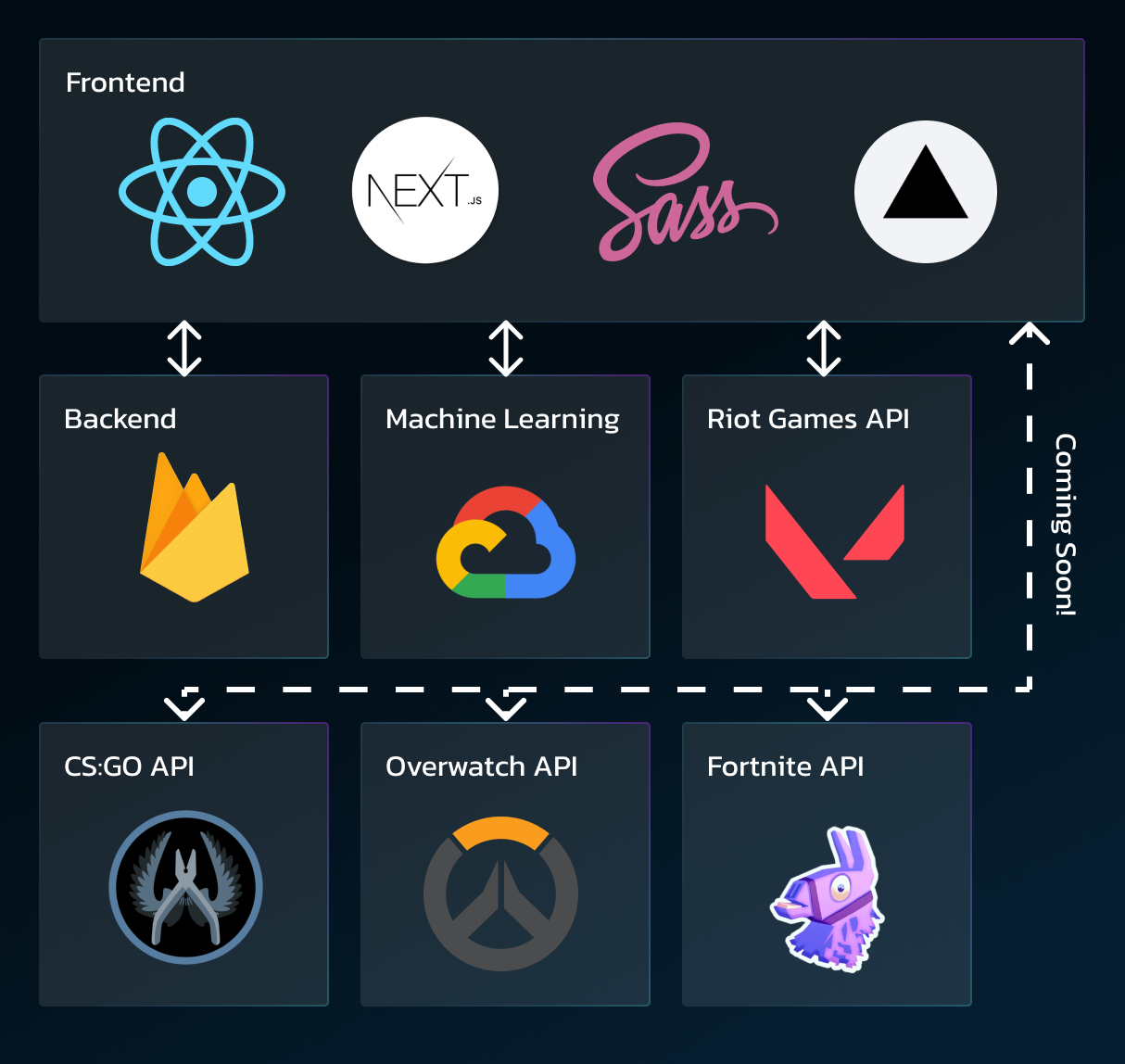 While not our backend, the frontend also communicates directly with Google Cloud's Machine Learning APIs as well as Riot Games's Valorant Ingame API using the unofficial open source APi developed by Henrik-3. In the future, we would like to add additional support for other game APIs such as League of Legends, Counter-Strike: Global Offensive, Apex Legends, and more.