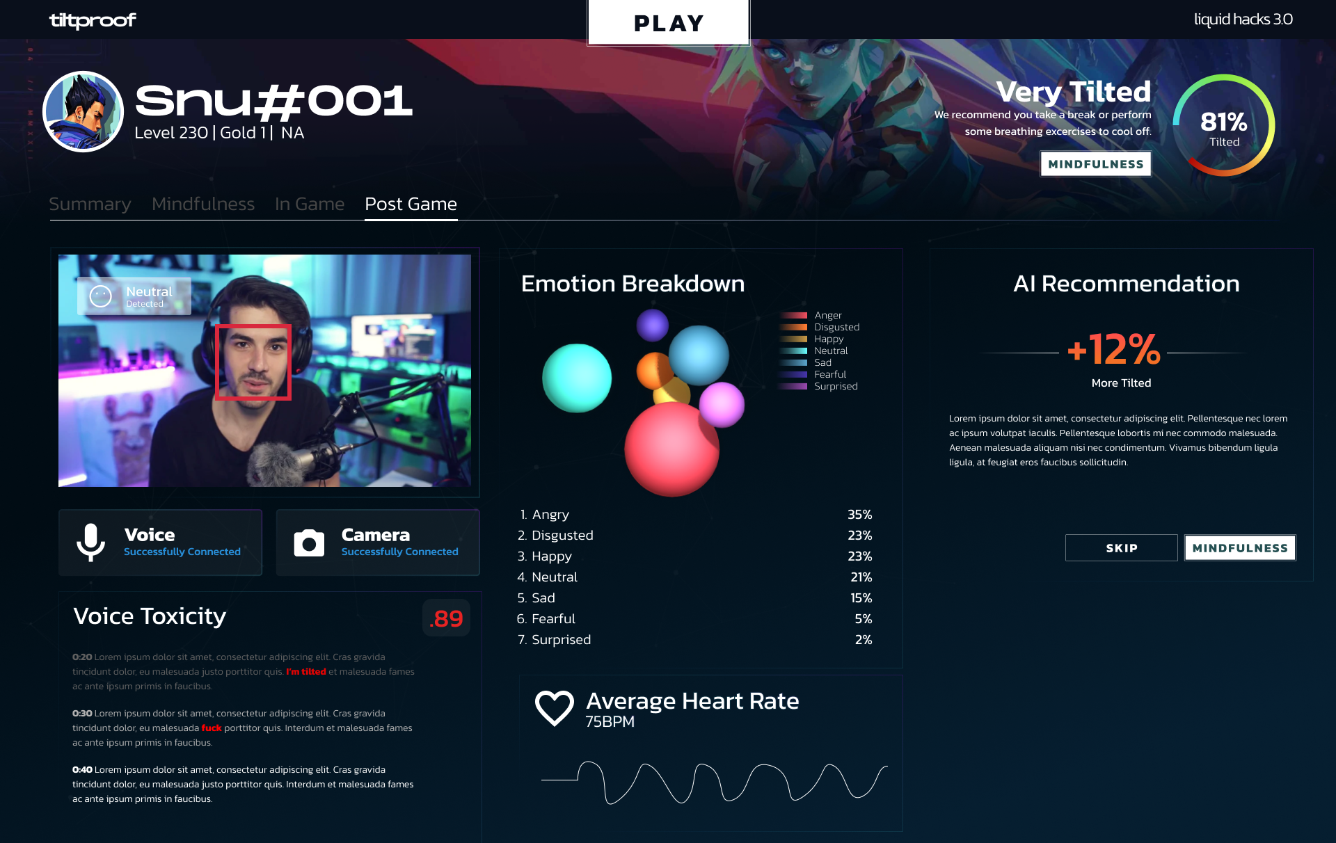 Tiltproof is a web application that uses machine learning to allow casual gamers, professional athletes, and esport coaches to measure, track, and act on players' decline in mental health and increase in toxic behavior when playing competitive video games.