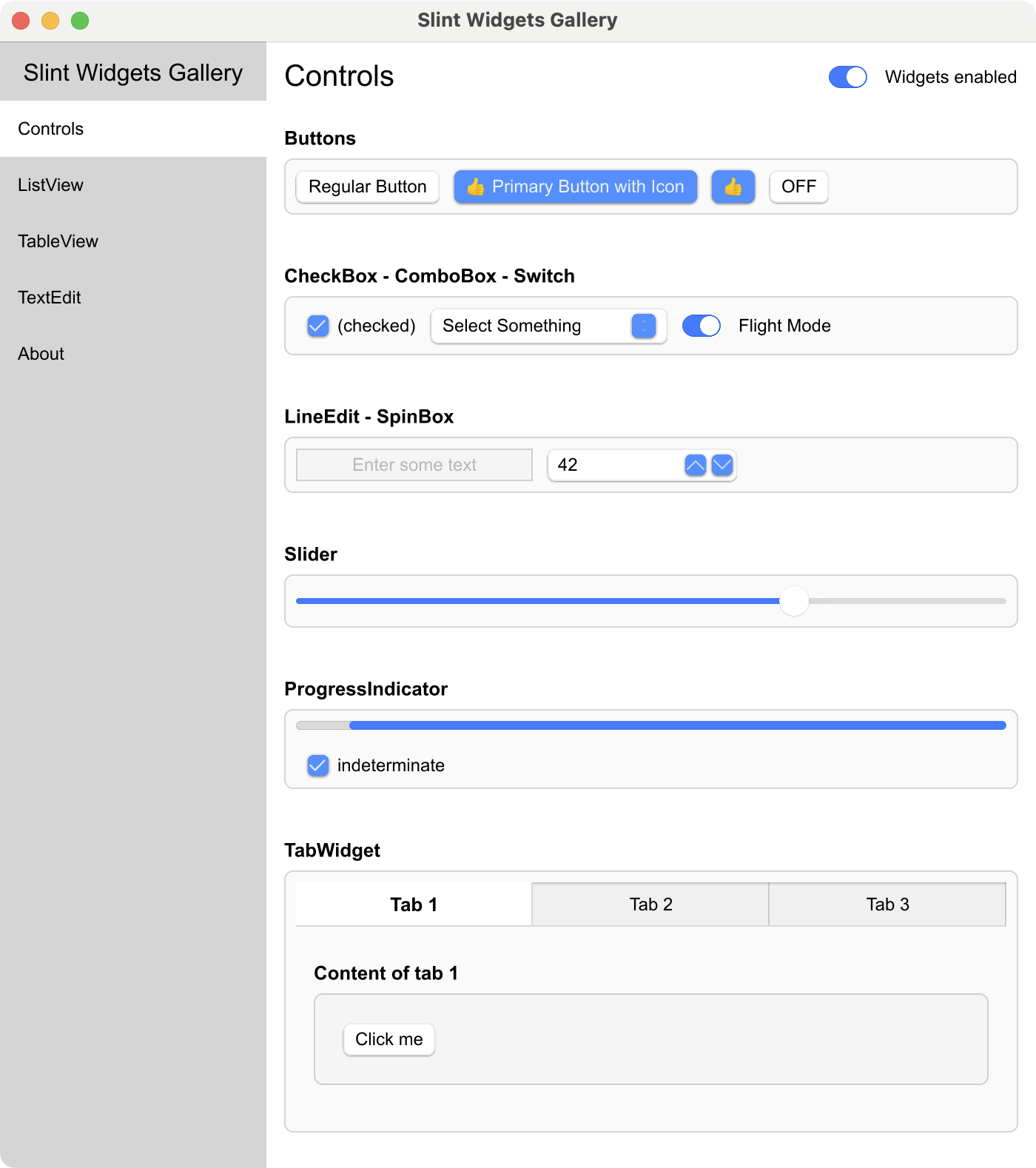Slint is a toolkit to efficiently develop fluid graphical user interfaces for any display: embedded devices and desktop applications. We support multiple programming languages, such as Rust, C++, and JavaScript. We invite you to use Slint and be part of its community.