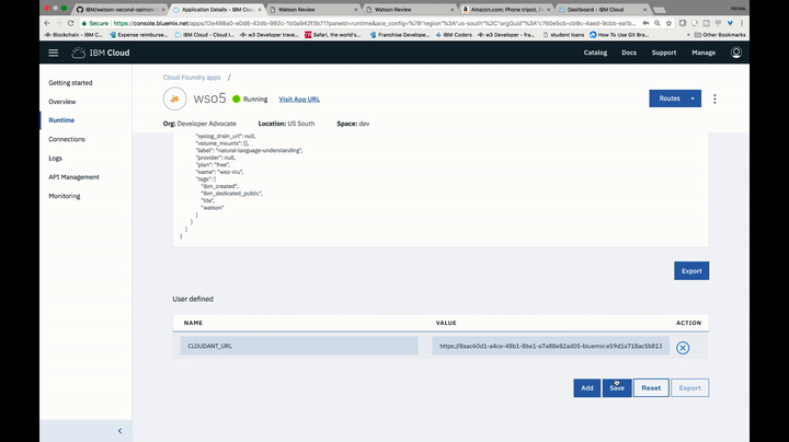 VCAP_SERVICES. Entonces podrás ver el apartadocloudantNoSQLDBy debajo de el el apartadourl. En el apartado deName, escribe elCLOUDANT_URL, y debajo de el campoValue, pega laurlde la seccióncloudantNoSQLDBen el apartado deVCAP_SERVICES.