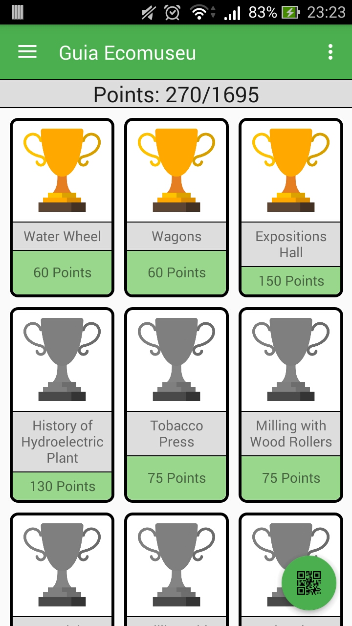 - Conquistas para cada area que o usuario visitar (para desbloquear a conquista, somente por leitura de algum QR Code da area)