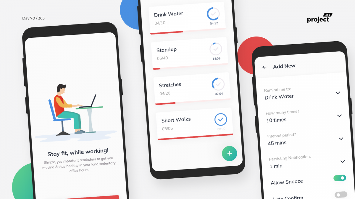 Office Assistant is React Native application for both Android and iOS that that helps you maintaining good health while at work by reminding you to keep moving.