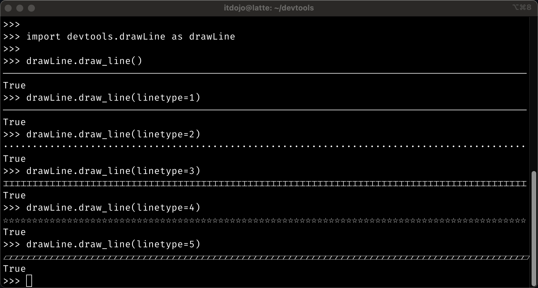 | draw_line | drawline() | Draws horizontal line in terminal. |