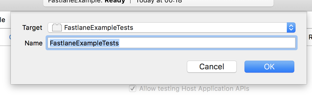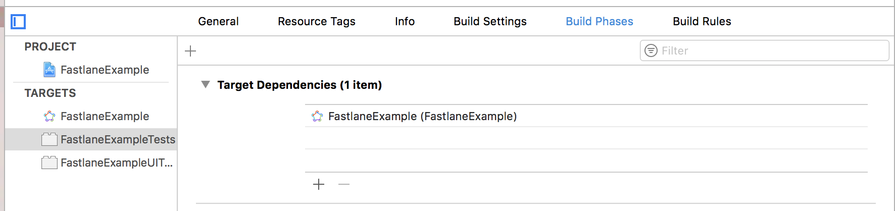 FastlaneExamplefromFastlaneExampleTests' target dependencies - Set host application to none