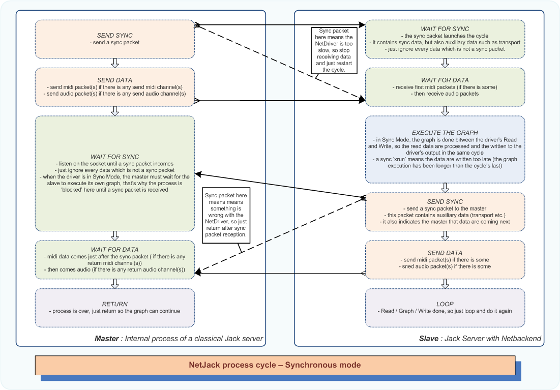 - the Master want to wait for current data, because we want a zero latency system, and we know the network bandwidth will not be filled, so data can arrive quickly. So wait some time to 'return' data from the slave. The master will block the jack server, but normally, not too long because data are supposed to be received in less than one cycle. This is the fast Netjack2 network mode : in a given cycle, the master just wait for the 'return' data.