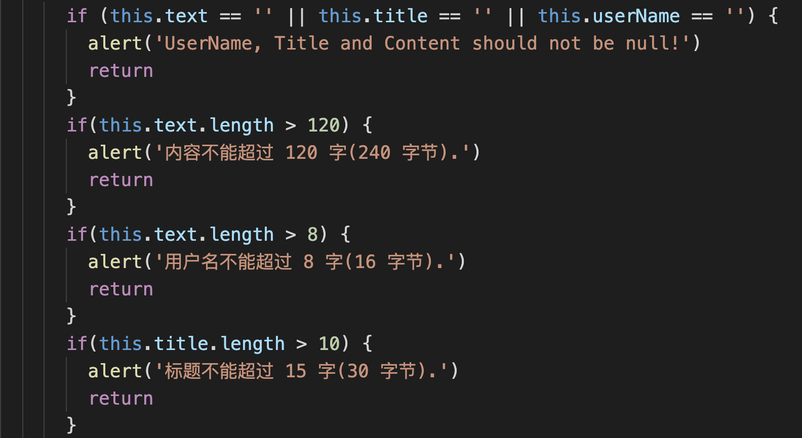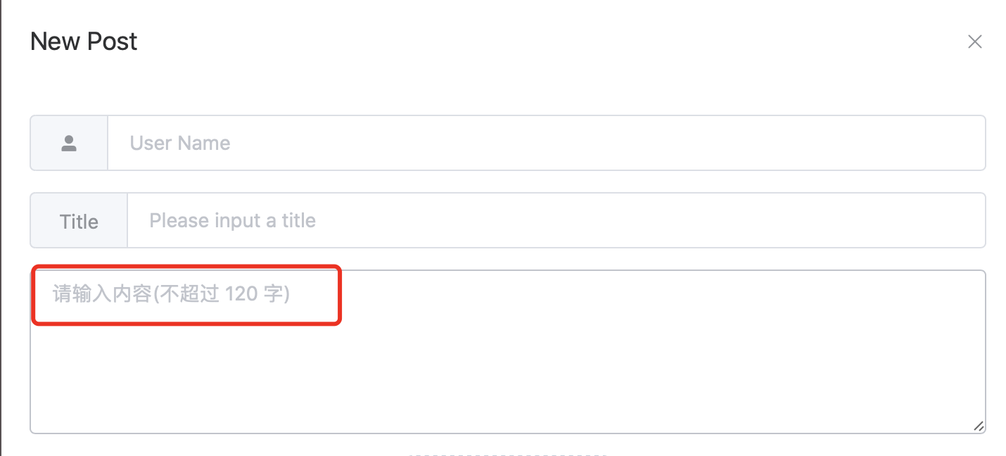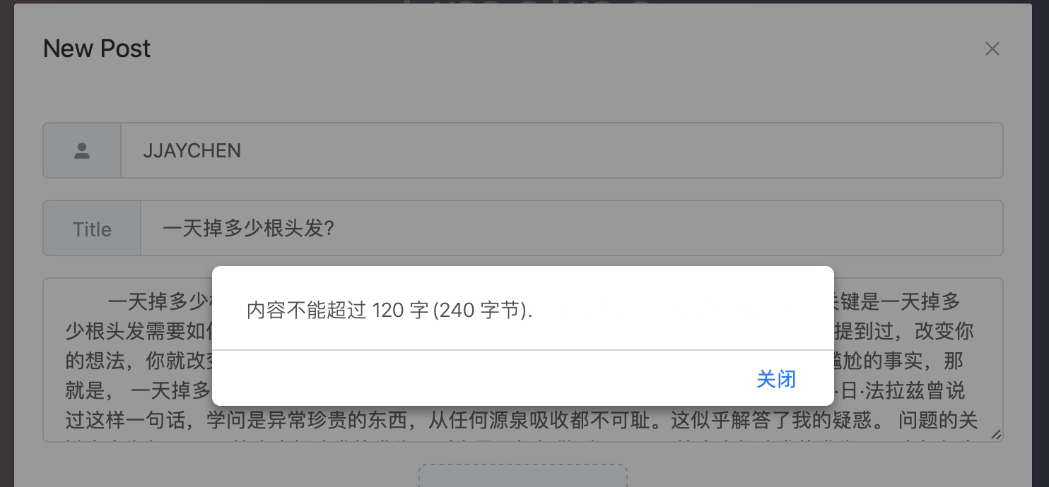 是由于数据库中限制文本内容不超过 240字节(也就是 120 个汉字),而前端并没有对用户的输入做限制,所以导致了这样的错误,使得用户得到了糟糕的体验。于是我们增加前端的逻辑,提示、限制用户的输入: