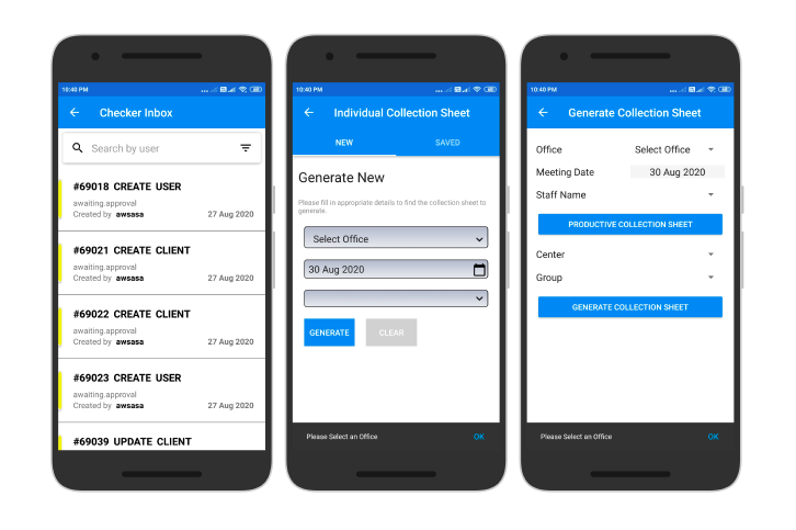 This is an Android Application built on top of the MifosX platform and written in Java and Kotlin. It is based on Mifos X - a robust core banking platform that is developed for field officers using which they process transactions, keep track of their client’s data, center records, group details, different types of accounts (loan, savings and recurring) of the client, run reports of clients, etc. Its sole purpose is to make field operations easier and effortless. This application also provides an offline feature that allows officers to connect with clients and provide them financial support in remote areas as well.
