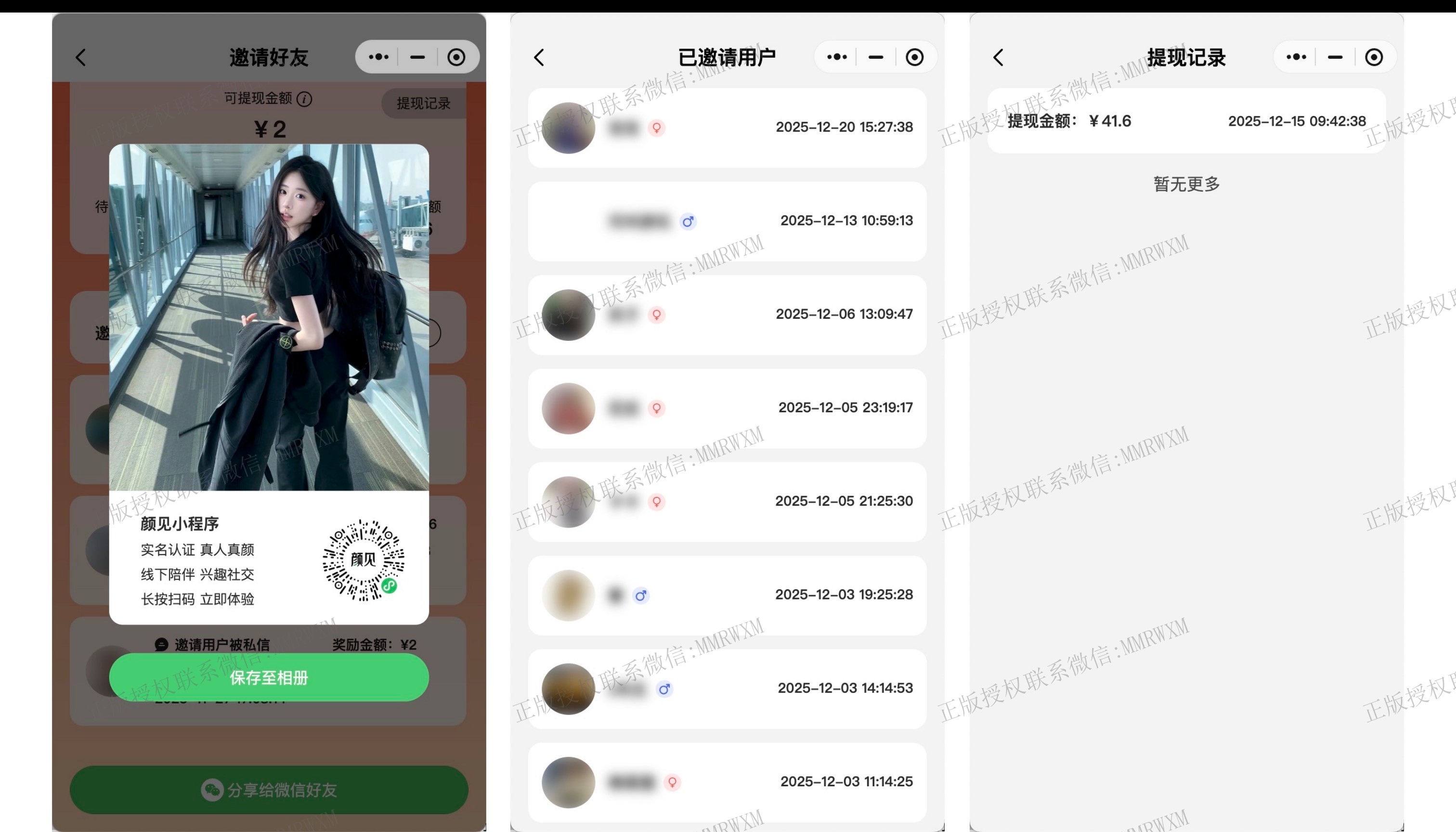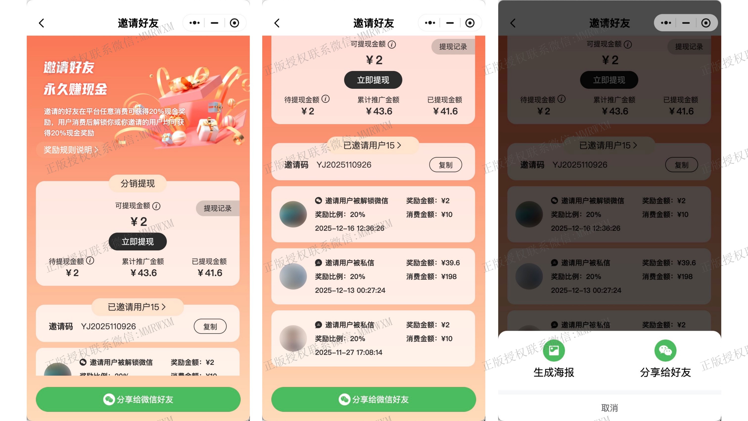 - 邀请好友分销奖励: 用户可以直接分享给好友 或是生成分销海报,他人通过链接或是扫码注册后永久绑定用户,他人消费后用户获得一定比例分成,分成比例可灵活配置