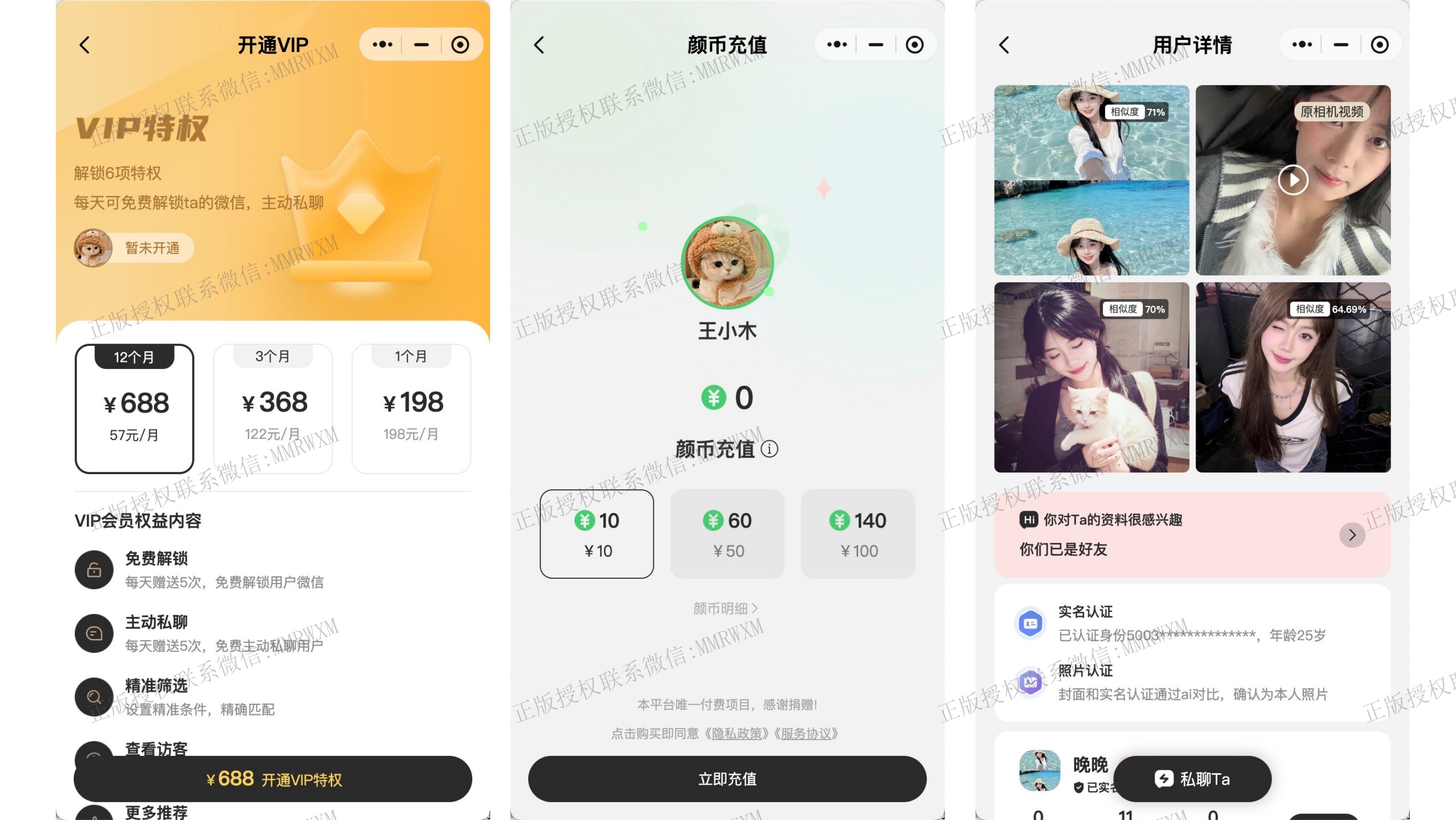 - 颜币充值: 充值功能,充值后的颜币可用于单次颜币消费,如:解锁私信,申请微信