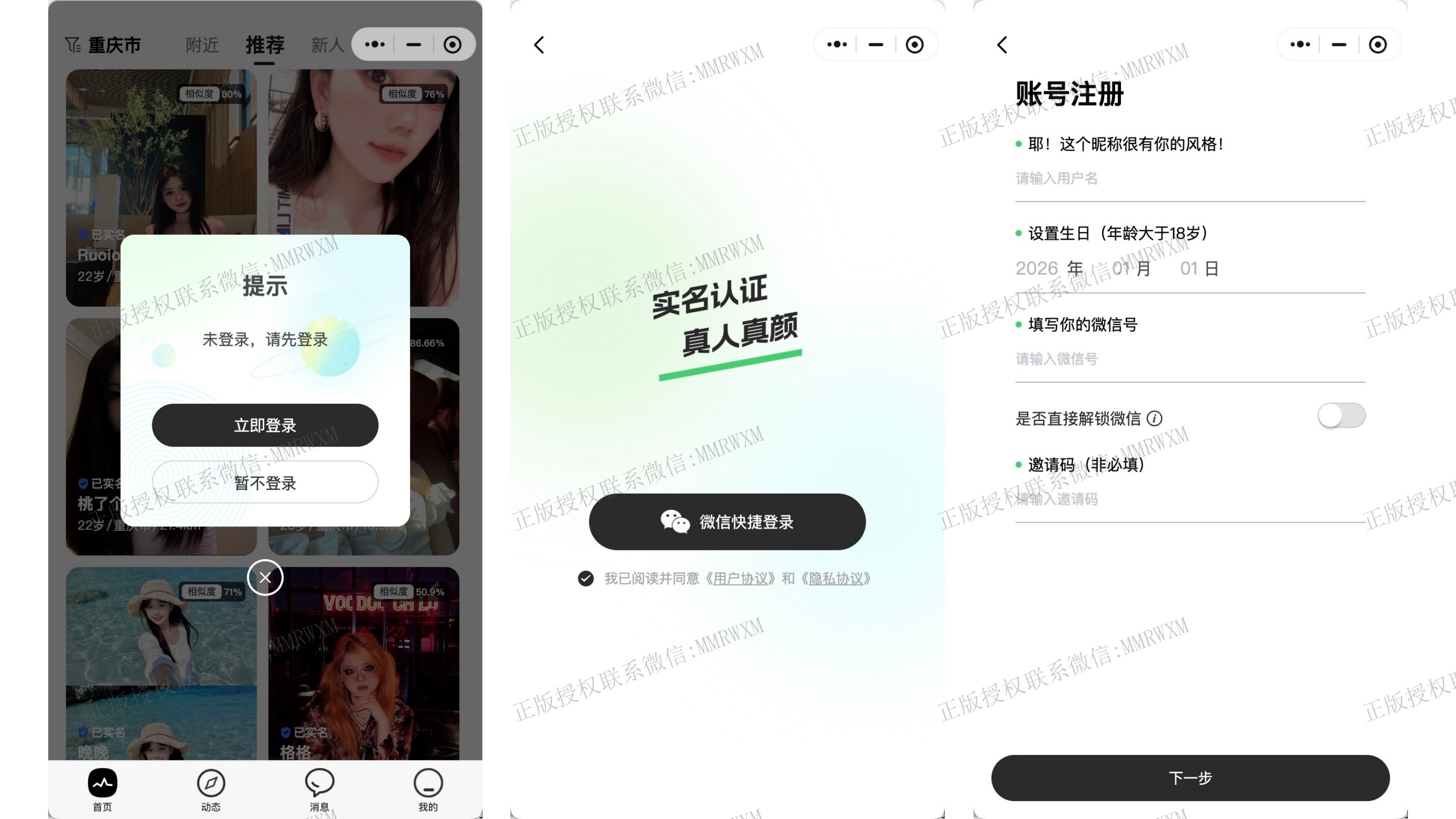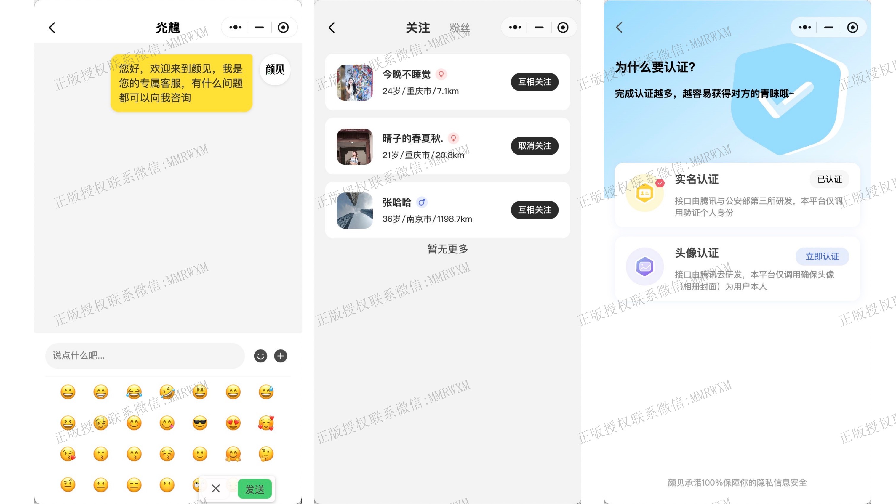 《颜见》是一款真人真颜,严格检验用户身份信息和相册真实性的社交交友软件开源项目,主打用户真实,高质量社交,软件有严格的用户人脸核身检测和相册相似度比对等机制,确保用户真实性,用户可以通过申请解锁私信或解锁用户微信号添加好友,软件中包含有达人广场,朋友圈社区,im实时聊天,vip充值等丰富模块,本项目为微信原生小程序,完美适配微信小程序生态,性能优越,使用更丝滑,功能完整,盈利模式完善,高度配置化,功能模块化,已对接支付接口,只需要简单的修改配置文件中相关信息,几天时间即可快速部署上线,减少开发的时间成本,金钱成本,技术成本,将更多的精力放在产品运营上。