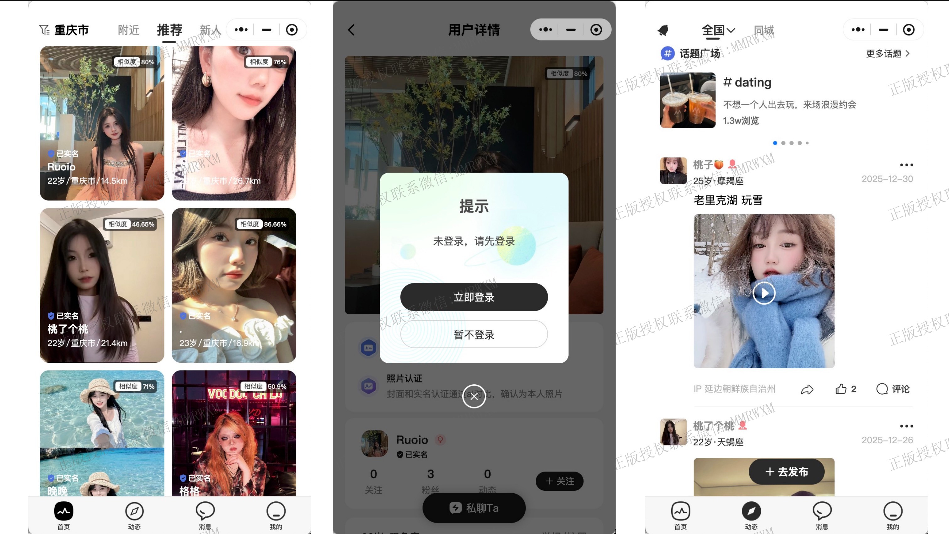 │ ├── pages/ # 页面视图 (首页、动态、消息、我的)