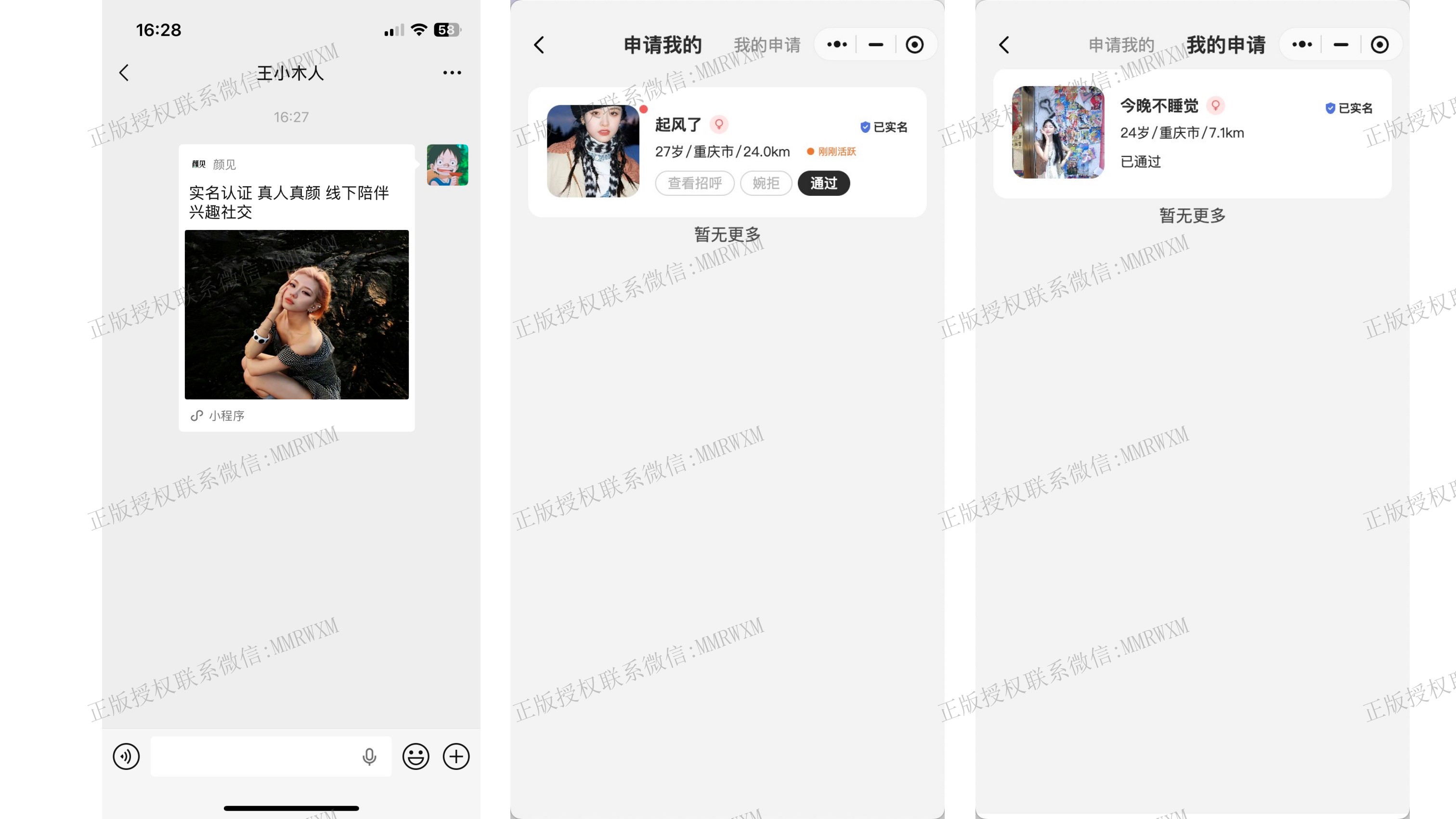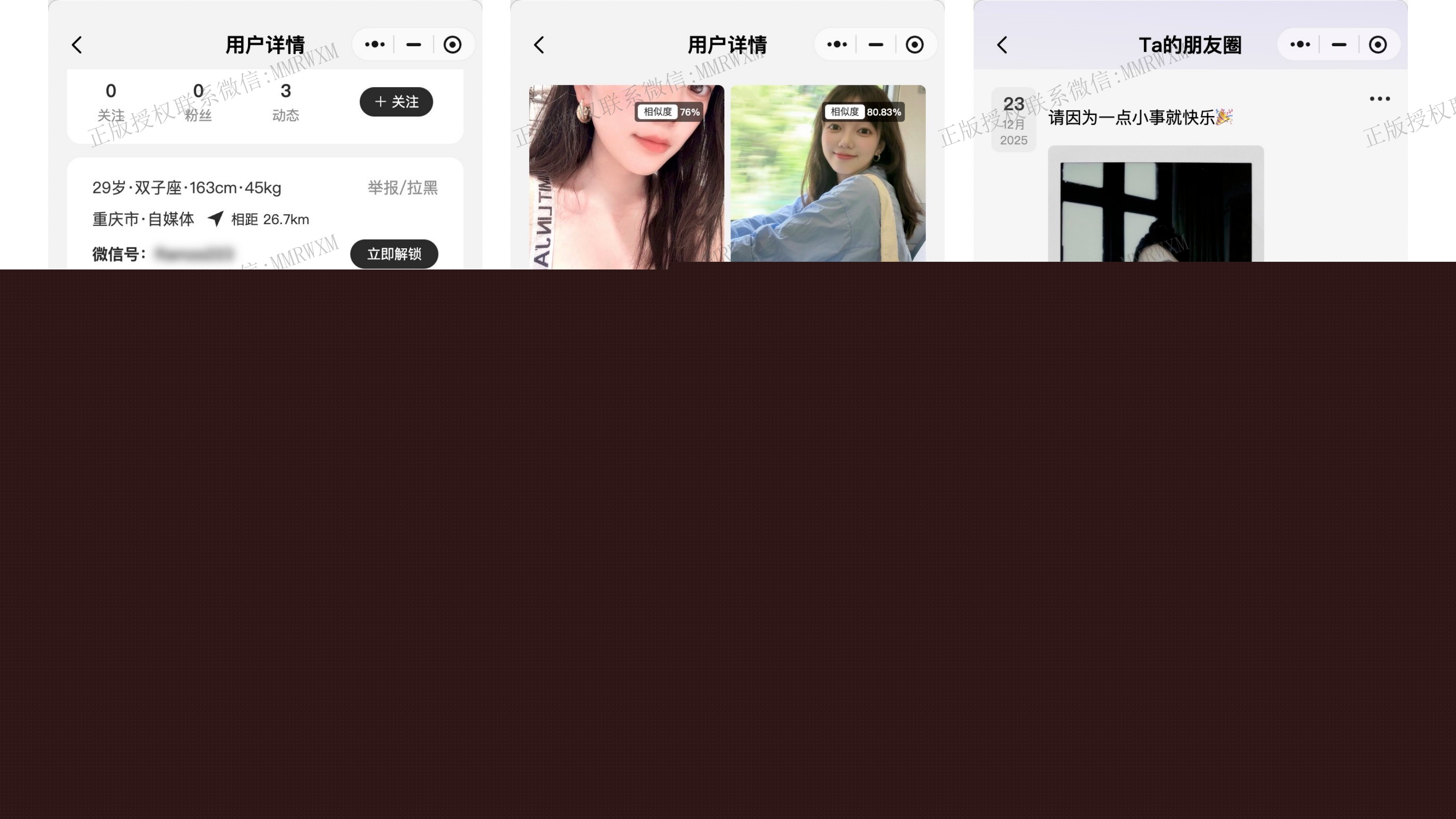 - 申请微信: 用户单次付费或者vip免费申请微信,用户可申请微信,微信申请成功后,用户可查看微信申请结果,复制微信号
