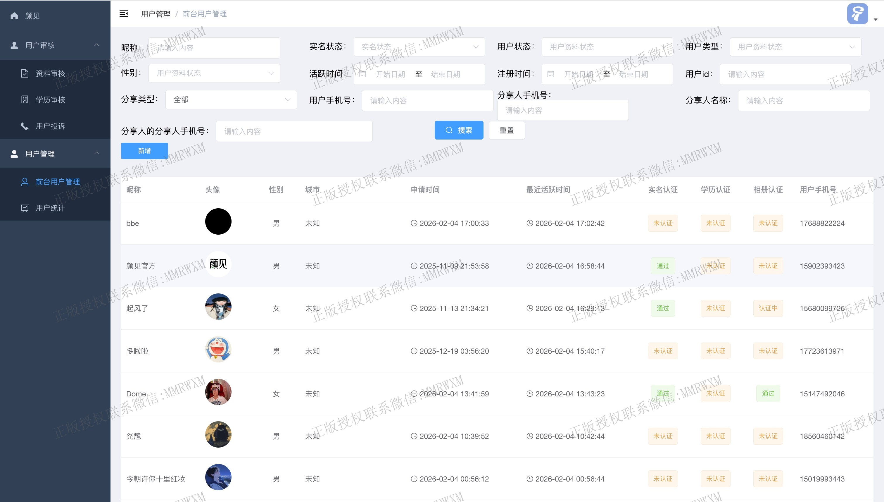 - 资料审核: 查看用户相关资料信息,可拉黑,禁用账号等