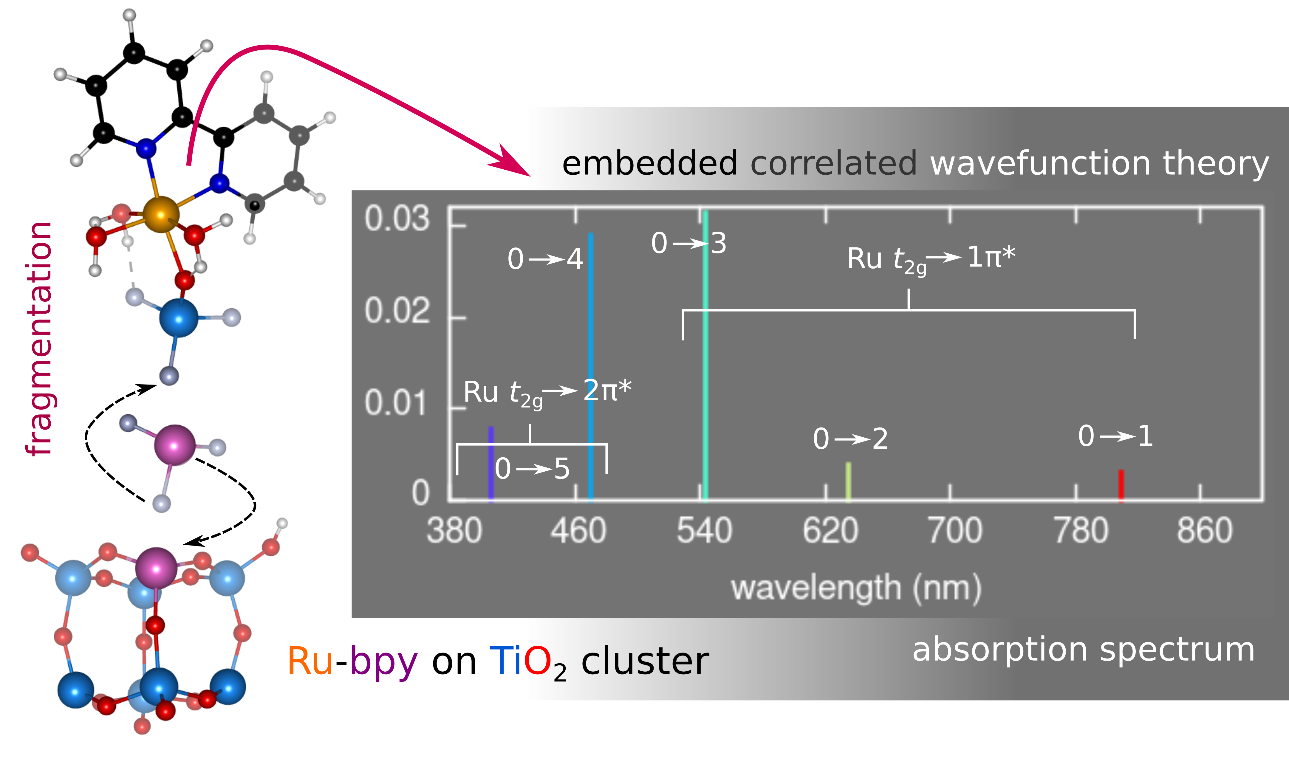 - J. M. P. Martirez and E. A. Carter, Metal-to-ligand-charge-transfer spectrum of a Ru-bipyridine-sensitized TiO2 cluster from embedded multi-configurational excited-state theory, Journal of Physical Chemistry A, 125, 4998-5013 (2021)