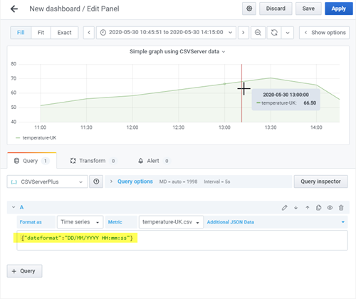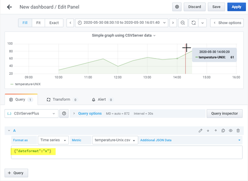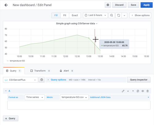 - The name of the line in Grafana comes from the CSV file's value column (Temperature-ISO in this case).