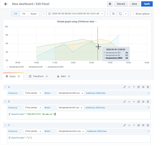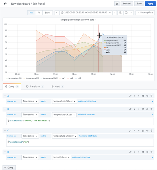 Grafana allows multiple queries to be sent together to the backend datasource, displaying a separate line for each query 'target'. For example, we could display all three of the above CSV data sets on the same graph using a set of three queries like this: