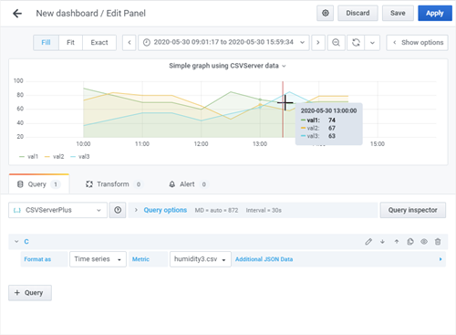 Alternatively, CSV files with more than one value field automatically create lines for each of these fields. The sample data file Humidity3.csv, for example, generates a three line graph from a single query.