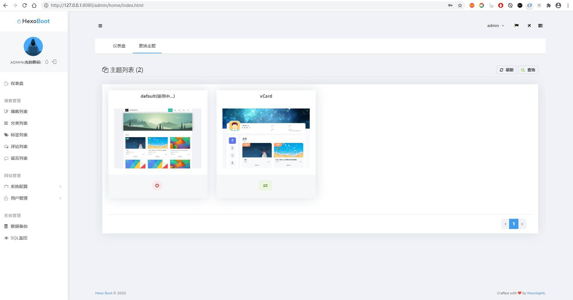 开发阶段:下载主题源码,修改名称(比如 hexo-boot-theme-abc 改成 abc),然后将整个文件夹复制到项目的 resources/templates/theme 下(与 default 目录同级),启动项目即可。