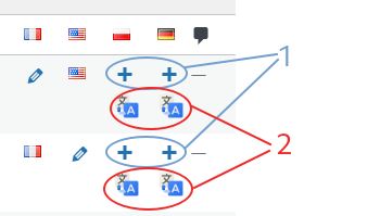 For each post you will see the standard Polylang translation options (i.e. a plus sign - add a new post of a given language, a pen - edit the linked language version of the post, a flag - edit current post). This is marked in blue ovals with a number "1" in the image above.