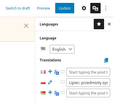 - If you are in a single post edit screen, you can also auto-translate it in a similar way as in the post table screen. If you are in the gutenberg block-edit screen, please click on the polylang icon in the top-right corner. Otherwise look for the polylang metabox in the right side of the screen. You should be able to see something like this: