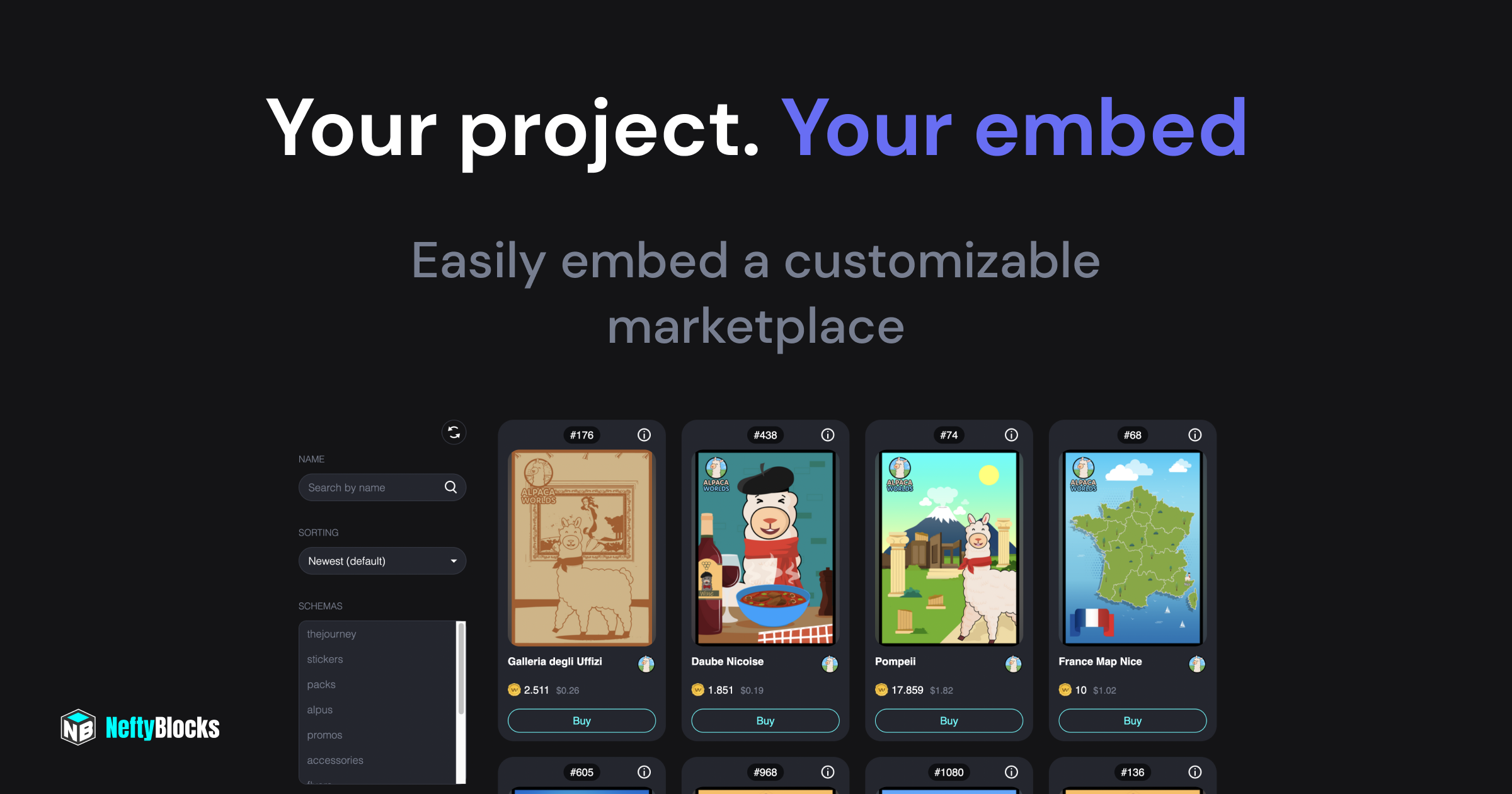 We at NeftyBlocks understand the importance of keeping your users engaged. We want to make it easy for you to keep your community of NFT gamers, collectors and enthusiast close to your project. So, we have created a marketplace for you to embed in your website and keep your users engaged with what matters most, your NFT project!