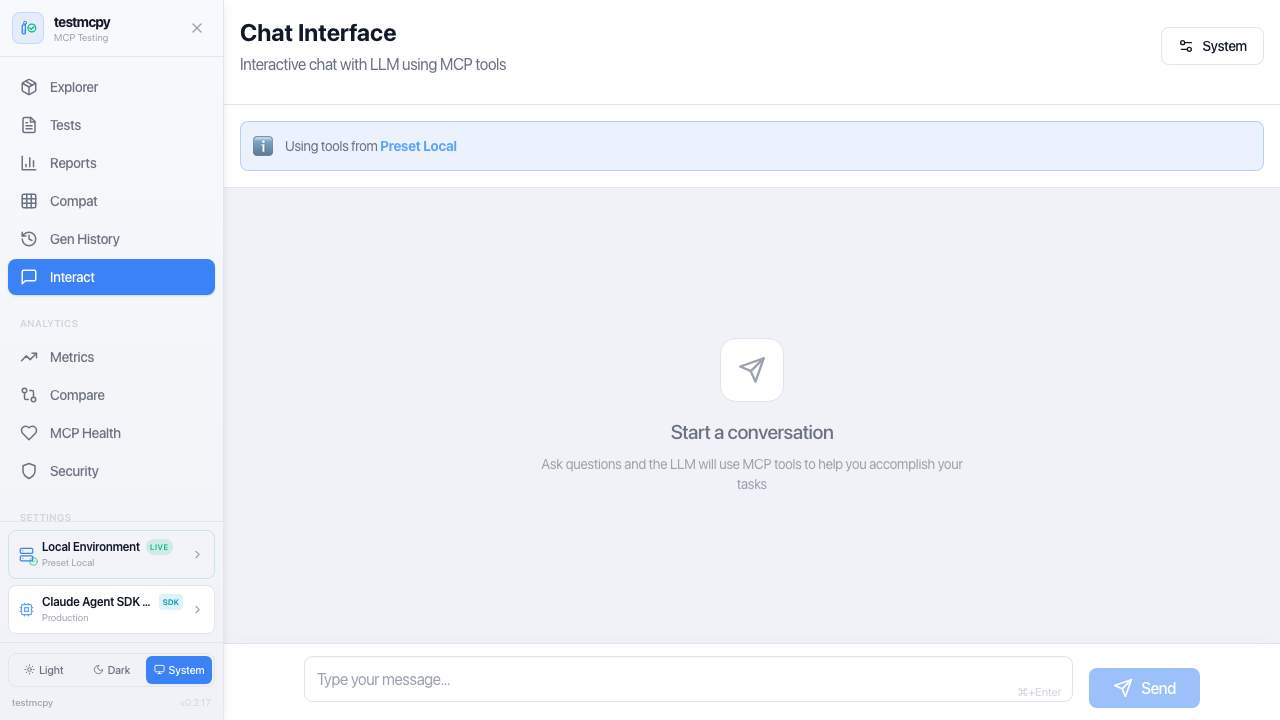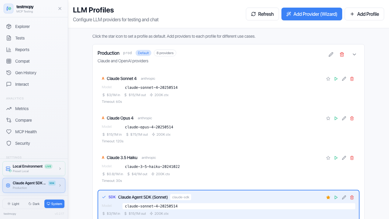 Test with Claude, GPT-4, Llama, and other models. Works with both paid APIs and free local models via Ollama. Includes a Claude SDK provider for subprocess-based MCP support.