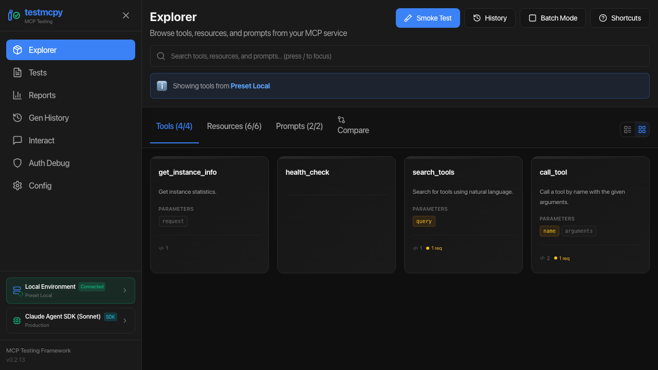 MCP Explorer | Tool discovery, smoke tests, schema viewing |