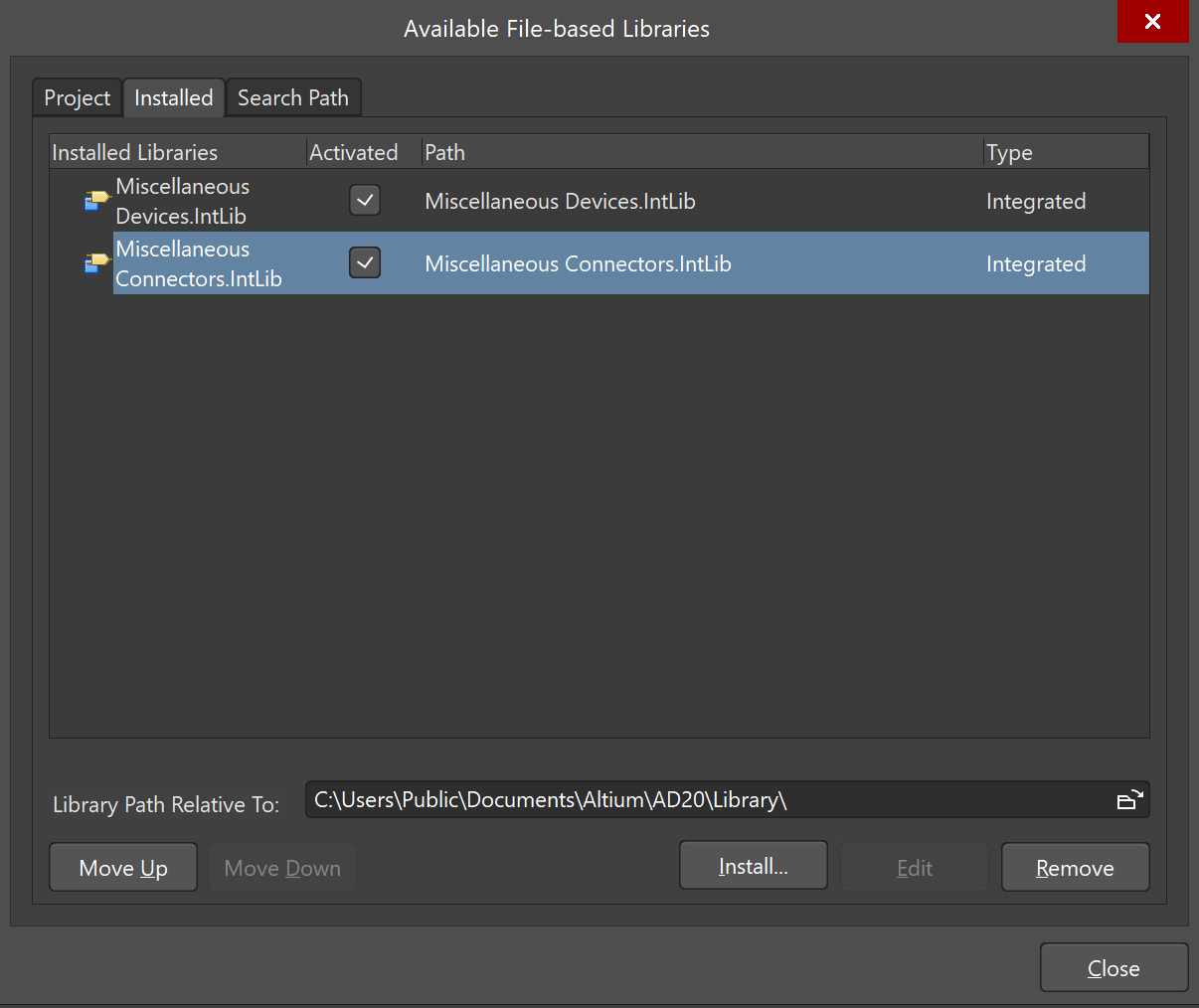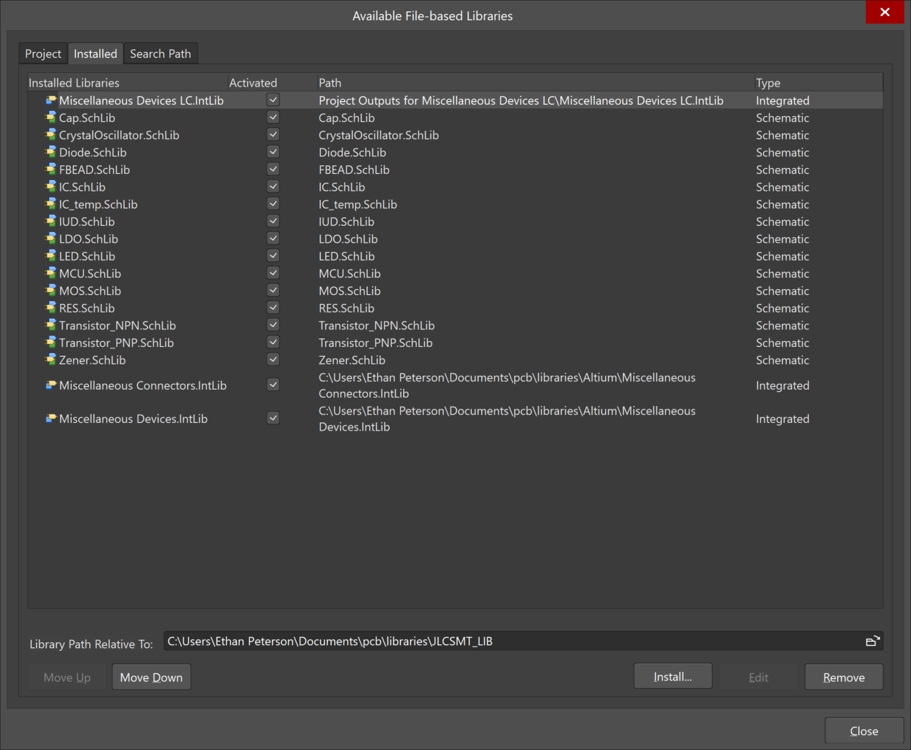 Your final available libraries panel should look similar to the photo below. Be sure to also keep the Altium default libraries and search for parts when making your schematic through the integrated library (using the components panel) and not the schematic libraries themselves.
