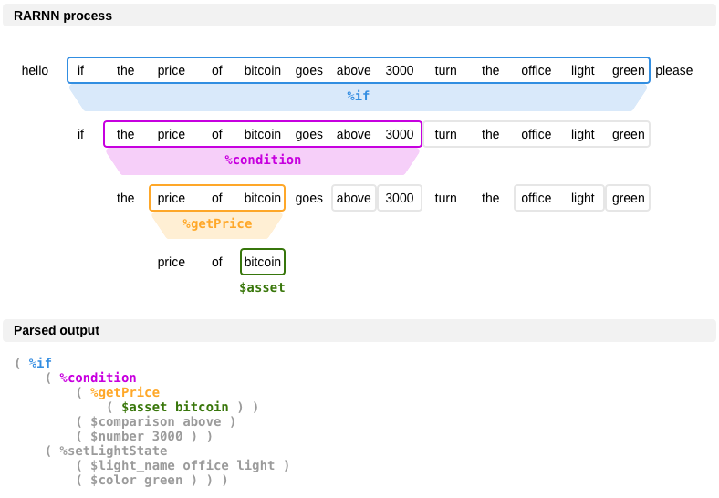 Of course in order to parse a nested intent structure, we need nested intent training data. Examples are generated with a natural language templating language called Nalgene which produces both a flat string (input) and a parse tree (output). Templates define a number of %phrases and $values (leaf nodes) as well as filler ~synonyms. The generator takes a random walk down the tree to build each example. Here's a snippet from the grammar file: